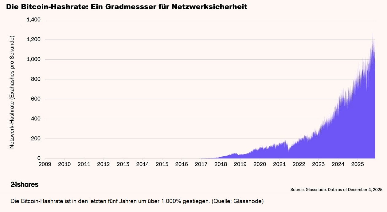 Bei der Evalulierung des ersten Punktes hilft ein Blick auf die Hashrate. Diese spiegelt die gesamte Rechenleistung wider, mit der Miner das Netzwerk schützen. Je höher sie ist, desto teurer und unwahrscheinlicher werden (erfolgreiche) Angriffe auf die Integrität der Blockchain. In den vergangenen Jahren ist diese Kennzahl massiv gestiegen, was Bitcoin zu einem der sichersten verteilten Netzwerke überhaupt macht. Seit seinem Start 2009 gab es keinen erfolgreichen Angriff – ein Grund, warum institutionelle Marktteilnehmer Bitcoin zunehmend in die Kategorie „digitales Rohstoff-Asset“ einordnen.